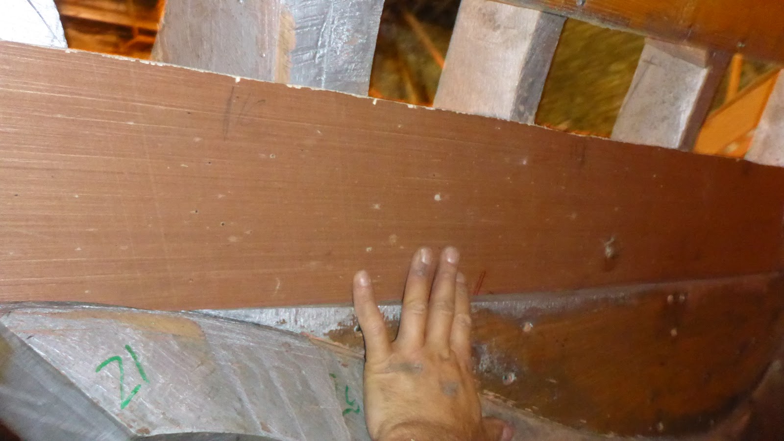 An dealbh sin déanta, thosnaíos ag feistiú an stráca an an mbarr. Mar a shíl mé, bhí an chuid fórsa ag teastáil, ach dheineas an botún céanna arís! Níor chuireas píosa adhmad ar bharr an stráca atá faoi, sínte idir dhá fhráma, de deascaibh sin, nuair a bhualas na dingeacha isteach chun an stráca a bhrú suas, scoilteas an clár ag an mbun...arís! Cén sord amadán atá ionam in aon chor?